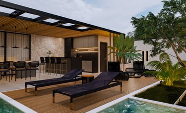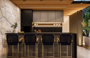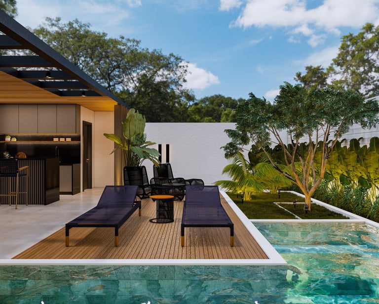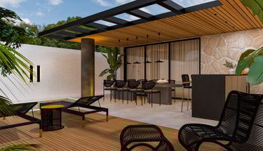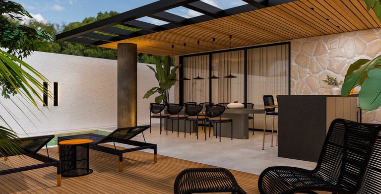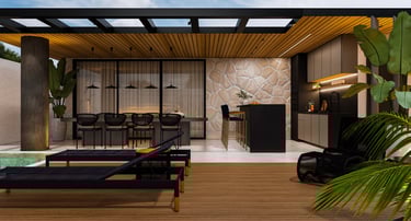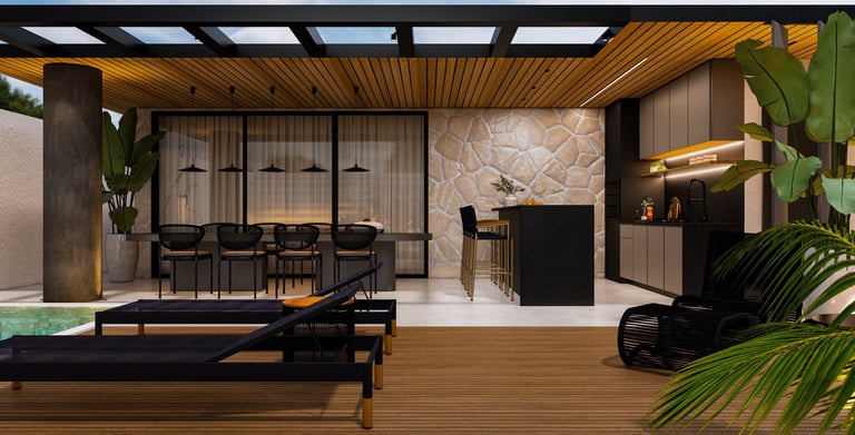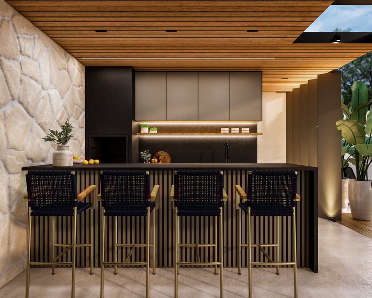 Projeto de arquitetura e interiores de uma varanda gourmet, localizada na Ponte Alta, Gama – Brasília/DF.